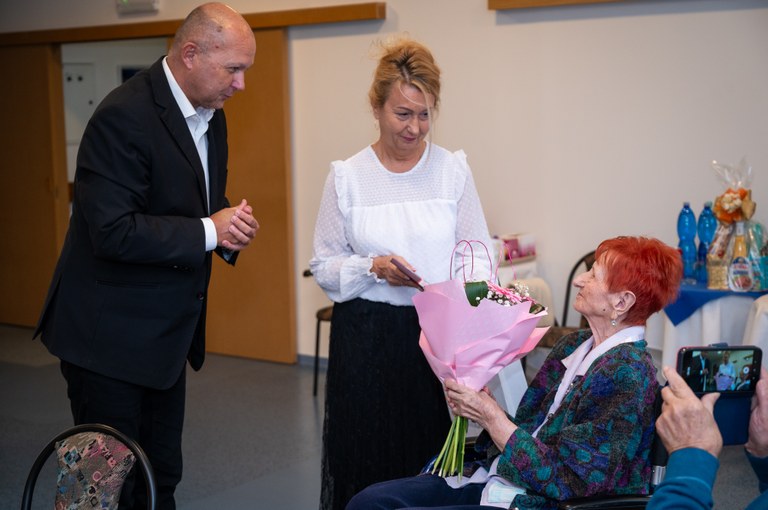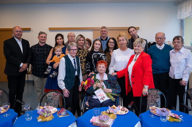 Do loňského roku bydlela v bytě ve Výškovicích, po nešťastné zlomenině krčku nyní přebývá v domově pro seniory na ulici Čujkovova v Ostravě-Zábřehu, kde také oslavila krásné kulaté jubileum. Sem za ní dnes také dorazila nejen její rodina, ale i starosta Martin Bednář a naše oblíbená koordinátorka akcí pro seniory Šárka Zubková.