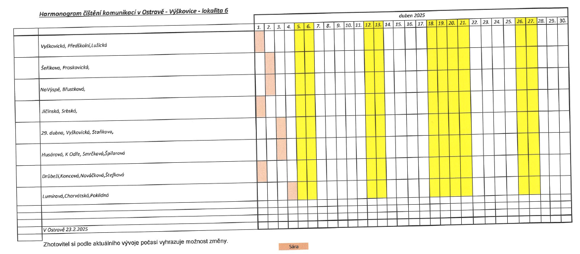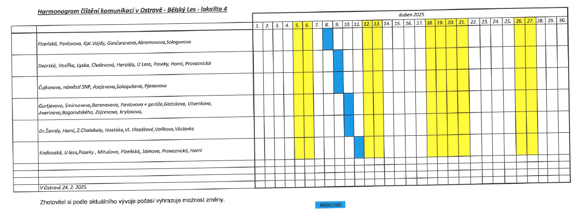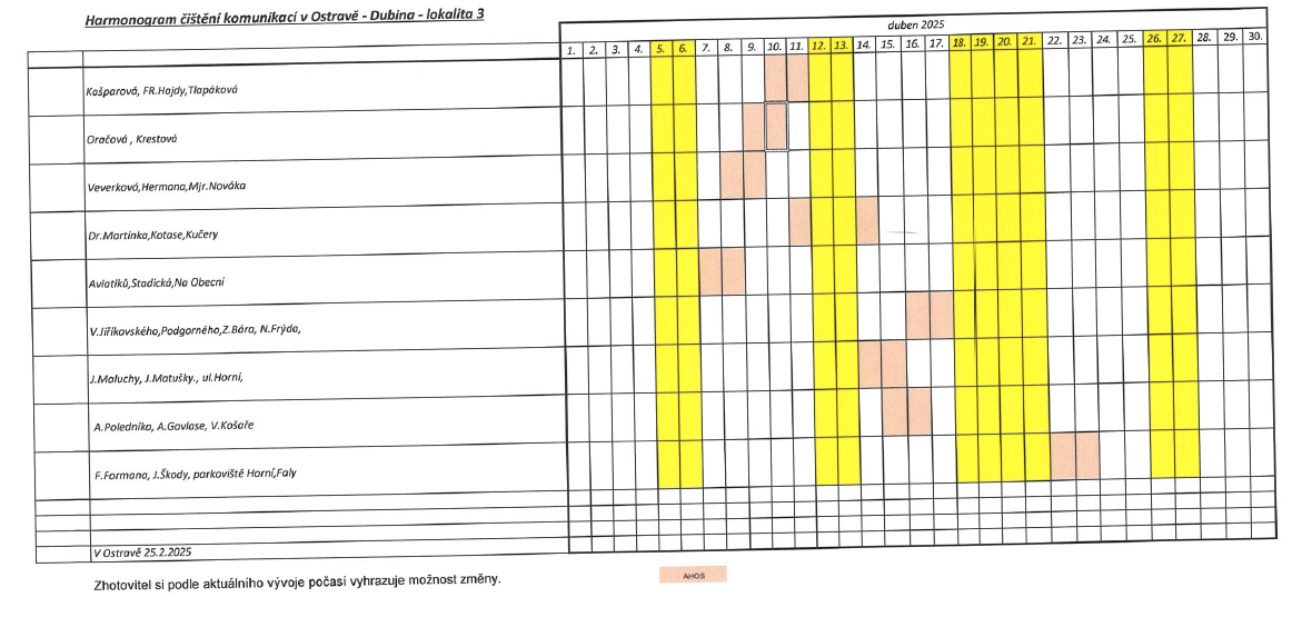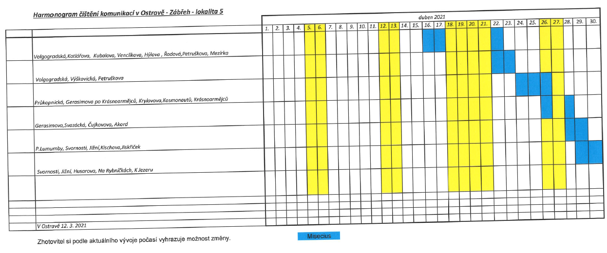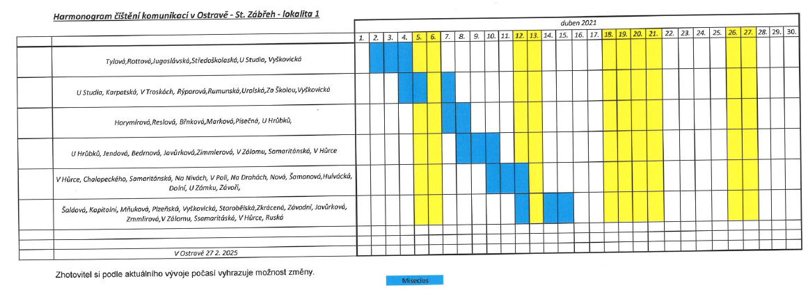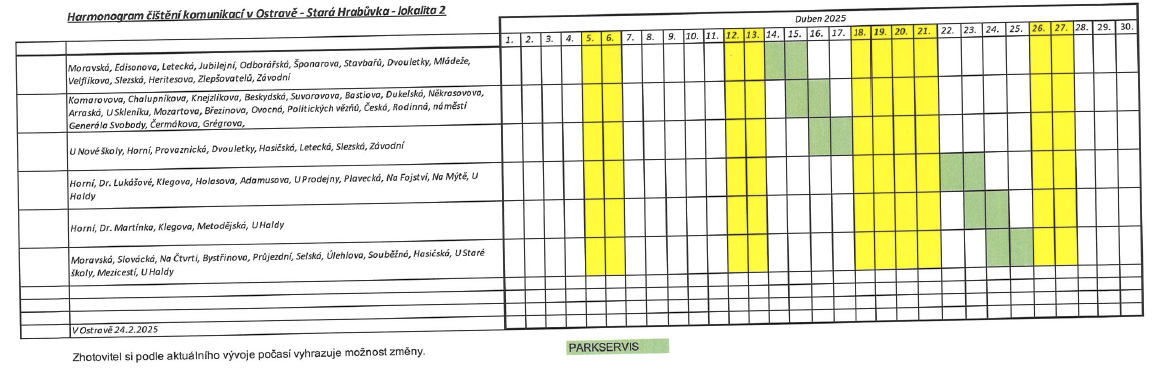 Rajónové čištění komunikací letos probíhá obdobně jako v předchozích letech. Městský obvod je pro tyto účely rozčleněn do 6 lokalit, ve kterých se úklid provádí podle podrobného harmonogramu. Ten je však pouze orientační, z důvodu nevhodných klimatických podmínek může docházet ke změnám. „O konkrétních termínech čištění informují přechodné dopravní značky zákaz zastavení a dodatková tabulka s uvedeným datumem a časem probíhajícího čištění, které jsou na jednotlivých úsecích umístěny v předstihu,“ uvádí místostarosta Otakar Šimík.