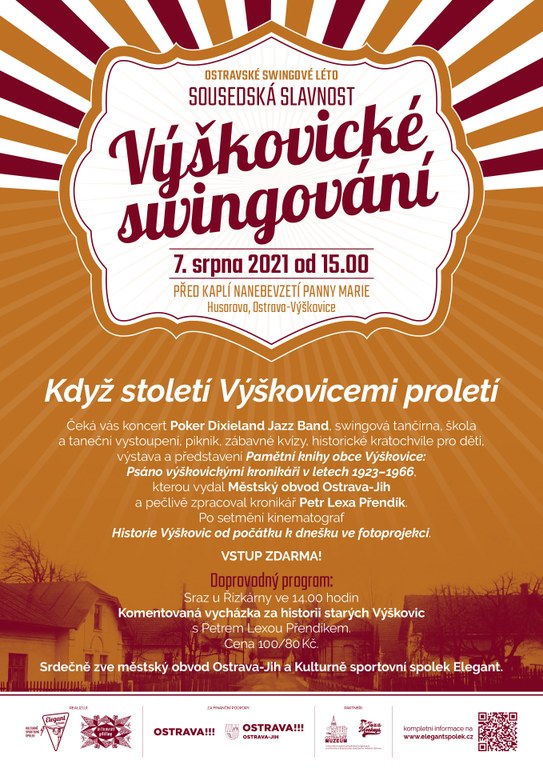 V sobotu 7. srpna se před kaplí Nanebevzetí panny Marie (ulice Husarova) uskuteční další z řady sousedských slavností na Jihu, tentokrát Výškovické swingování. Na příchozí od 15 hodin čeká Poker Dixieland Jazz Band, swingová tančírna, swingová škola a taneční vystoupení a další doprovodný program. Navíc si budou moci zájemci na místě zakoupit knihu Pamětní knihy obce Výškovice: Psáno výškovickými kronikáři v letech 1923-1966. Publikaci na místě představí její autor kronikář Petr Lexa Přendík.