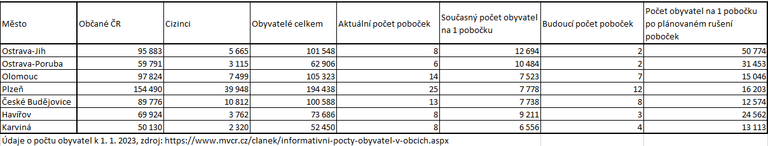 V Českých Budějovicích se srovnatelným počtem obyvatel bude od 1. 7. 2023 fungovat 1 pobočka pro 12 574 obyvatel, v Olomouci 1 pobočka pro 15 046 obyvatel, v Karviné 1 pobočka pro 13 113 obyvatel (přehled srovnání viz příloha).